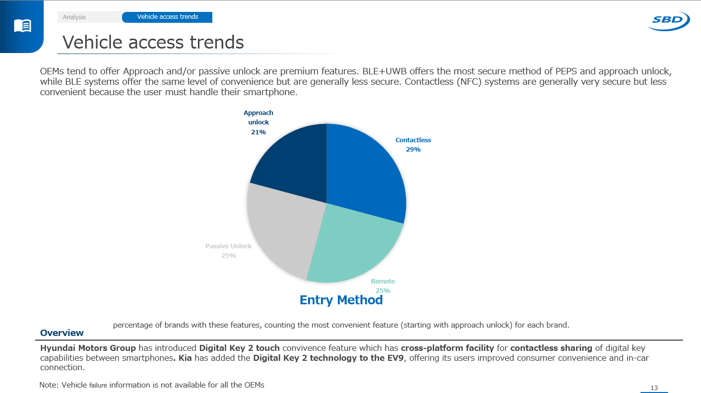 그러나 미래에는 디지털 키 시스템, 특히 스마트폰을 활용하는 시스템이 점점 더 보편적인 사용자 경험이 될 수 있습니다. 마찬가지로, 기본 차량 통합을 통해 디지털 키에 대한 접근성이 높아지고 OEM과 소비자 가전업체 간의 새로운 파트너십이 확대됨에 따라 디지털 키는 오늘날의 수동형 스마트키 시스템과 잠재적으로는 리모트키를 완전히 대체할 수 있습니다.